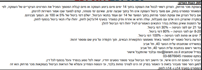 8.3. משתתף רשאי לבטל בכתב עסקה בכפוף לתשלום דמי ביטול כדין, בתוך 14 יום מיום עשיית העסקה או מיום קבלת המסמך המכיל את פרטי העסקה, לפי המאוחר וכל זאת בכפוף לכך כי מועד ביטול העסקה חל בתוך 7 ימי עסקים קודם למועד תחילת השרות במכר מרחוק או 18 ימי עסקים קודם למועד תחילת השרות במכר רגיל וכל זאת בתנאי שהשירותים אותם מבקש לבטל אינם ניתנים במלואם בחו"ל.